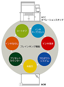 全操作タッチパネルになり操作性を向上。プリプレスからデータを入力し、インキデータのプリセット機能と印刷時での集中的な操作機能により、ACM(Akiyama Color Management)からの測色データをACC(Akiyama Color Control)オペレーションスタンドにフィードバックして数値による品質管理を実現します。